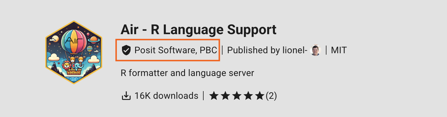 For example, Posit’s Air extension displays the “Posit Software, PBC” Verified Publisher badge, and “lionel-”, the developer from Posit who published the extension.